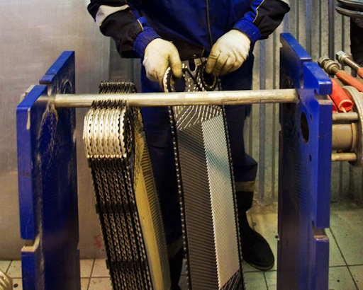 Наиболее эффективным способом очистки теплообменника является чистка с разборкой и вымачиванием каждой пластины из пакета в специальных ваннах. Cначала механически удаляются грубые отложения, затем производится окончательная очистка пластин путем их погружения в раствор химического реагента. Этот вариант обеспечивает более качественный результат. Визуально можно оценить качество очистки, необходимость замены поврежденных деталей и элементов. Также возможно наращивание дополнительной теплообменной поверхности и соответственно мощности. Далее проводится сборка, проверка оборудования, его опрессовка и передача заказчику.